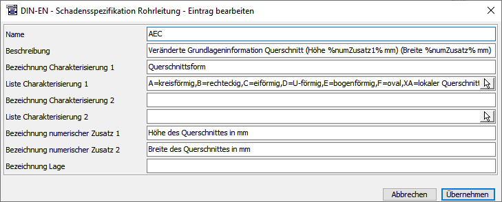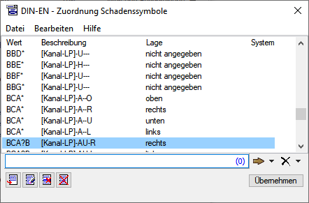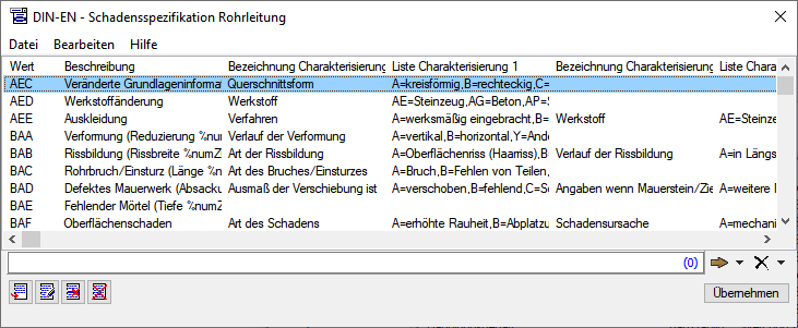 Für Leitungsschäden gibt es eine Auswahlliste nach DIN-EN 13508-2 [DIN-EN - Schadensspezifikation Rohrleitung].