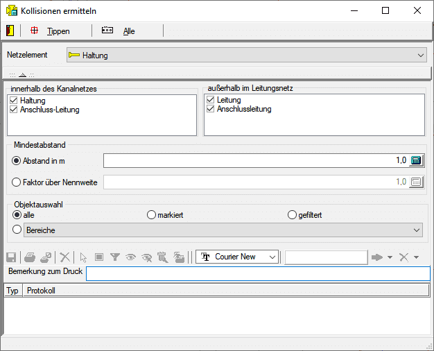 Für die Kollisionsermittlung muss ein Abstand angegeben werden. Dieser kann entweder ein fester Wert sein, oder er wird aus der Nennweite des getippten Netzelementes mit angegebenem Faktor ermittelt.