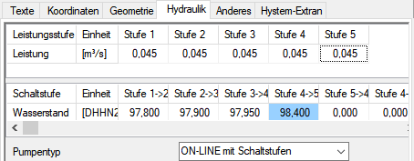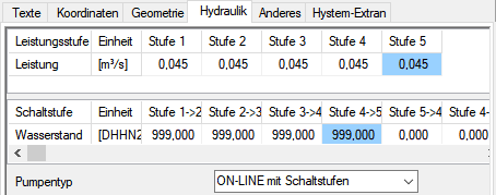 Ist dies erfolgt, so muss unter Datenbank, Bauwerk, Pumpe im Register Hydraulik der Pumpentyp und in Abhängigkeit davon die Leistungs- und die Schaltstufen der Pumpe eingegeben werden. Sinnvoll wäre in diesem Fall den Pumpentyp 2(ON-LINE-Pumpe mit Schaltstufen) zu verwenden.