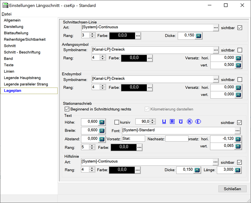 Diese Einstellungen gelten nur für die Darstellung der Schnittachse auf dem Lageplan.
