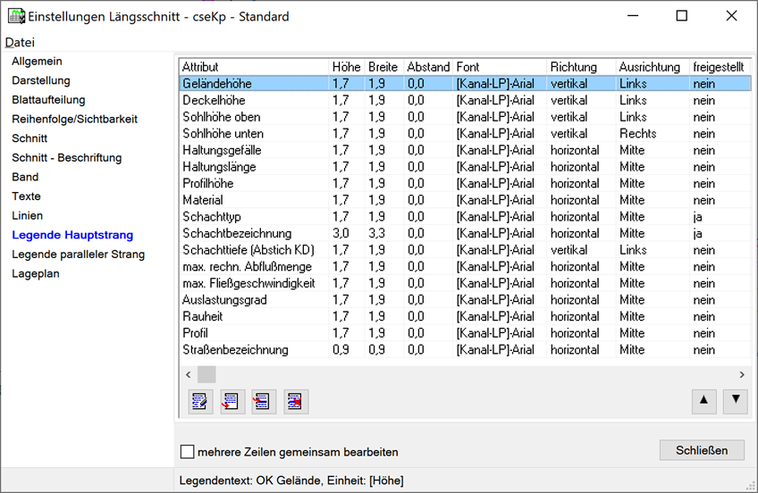 Das Register Legende Hauptstrang / Nebenstrang enthält in tabellarischer Form die Zuordnung der Schriftsätze und Ausprägungen zu den Beschriftungszeilen innerhalb des Legendenbereiches im Längsschnitt. Zusätzlich kann der Inhalt und die Reihenfolge der Beschriftungszeilen festgelegt werden.