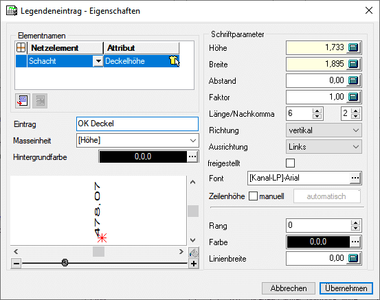 Faktor: Hiermit ist eine Umrechnung der numerischen Werte möglich. Z.B. für die Beschriftung der Profilhöhe, die standardmäßig in m erfolgt, könnte hier durch den Faktor 1000.00 eine Angabe in mm erfolgen.