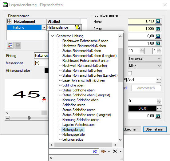 Im Dialogbereich Elementnamen kann für eine Legendenzeile das Netzelement und das jeweiligen Attribut definiert werden.