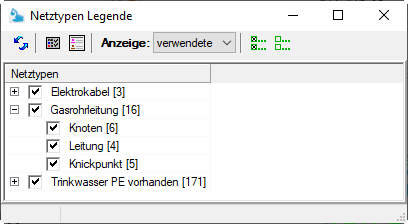 Mit der Funktion Legende Netztypen kann eine Legende erzeugt werden, mit einer beispielhaften Darstellungen von Netzelementen zu den ausgewählten Netztypen. Es werden nur Netztypen bzw. Netzelemente zur Auswahl angegeben, deren Sichtbarkeit in den Netztypeinstellungen nicht ausgeschaltet ist.
