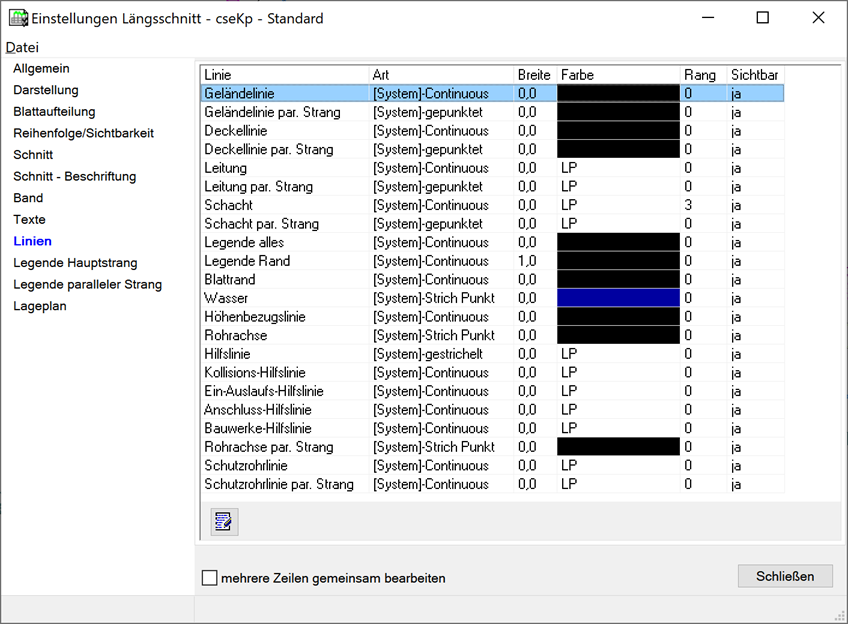 Das Register Linien enthält in tabellarischer Form die Zuordnung der Linienarten und der grafischen Darstellung der Linien zu den einzelnen Kanalelementen.