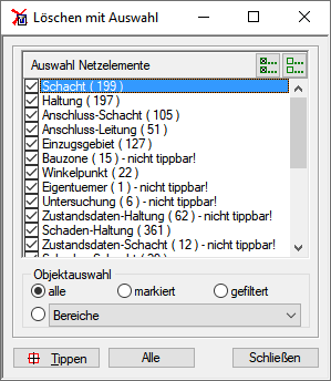 Diese Funktion ermöglicht das Löschen von Netzelementen, Teilen von Netzen oder kompletten Netzen unter Berücksichtigung von Auswahlkriterien (Markierung/Filter).