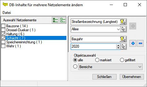 Die Datenbankfunktion zum Setzen von Eigenschaften für mehrere Elemente dient zum gleichzeitigen Bearbeiten einer identischen Objekteigenschaft mehrerer ausgewählter Objekte.