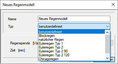 Mit dem vorhandenen Listenfeld Typ, wird der Typ des Regenmodells definiert.