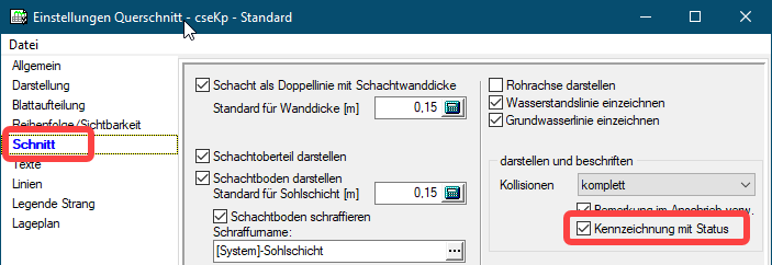 Um im Querschnitt eine Statuskennzeichnung dargestellt zu bekommen, sind die bereits genannten Voraussetzungen zum Objektstatus wichtig (siehe oben). Im Bereich „Schnitt“ der Querschnittseinstellungen muss zusätzlich noch der Parameter „Kennzeichnung“ mit Status definiert sein.