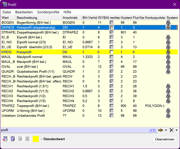 Wird beispielsweise im Dialog Datenbank, Haltung ein neues Profil ausgewählt, so wird bei Vorhandensein eines Höhen-Wertes das BH-Verhältnis aus der Profil-Auswahlliste gelesen und der Breiten-Wert automatisch berechnet.