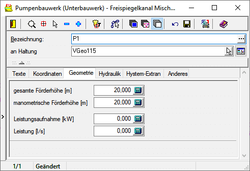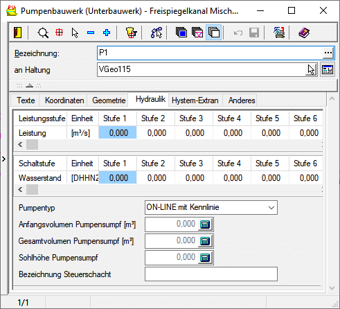 Für ein Pumpenbauwerk hat die Registerkarte Hydraulik folgendes Aussehen: