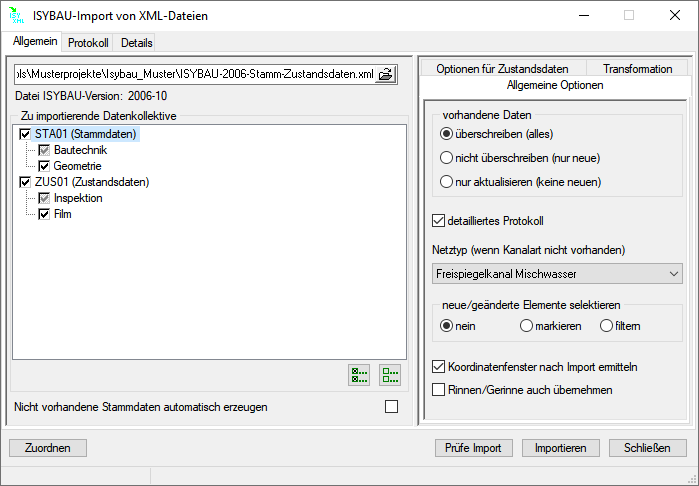 Sind Stammdaten, wie Schächte/Anschlussschächte bzw. Haltungen / Anschlussleitungen, welche beim Einlesen eines Datentyps benötigt werden, nicht vorhanden, so werden diese automatisch erzeugt. Das erfolgt aber nur, wenn eine Zuordnung eindeutig ist. D.h., sollen Haltungen/Anschlussleitungen erzeugt werden, müssen auch die Namen der Anfangs- und Endpunkte bekannt sein.