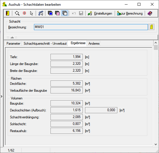 In der Gruppe Flächen werden die berechnete Deckfläche der Schachtbaugrube und die Verbaufläche der Baugrube angegeben.