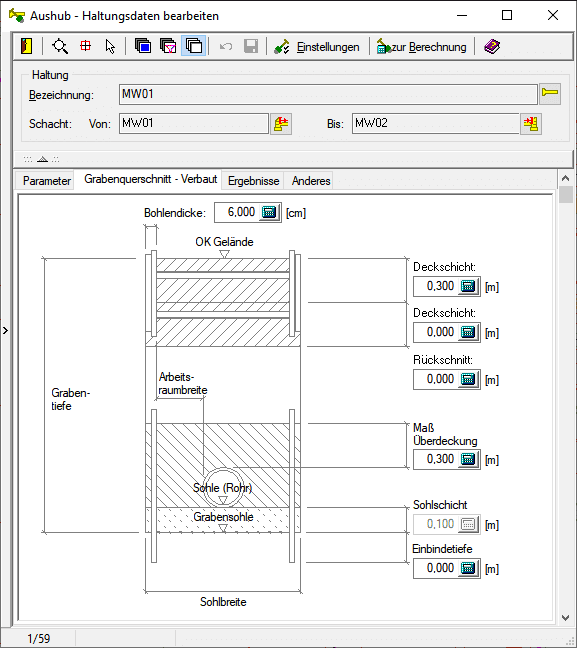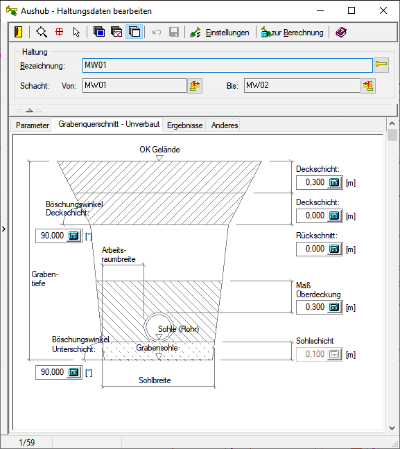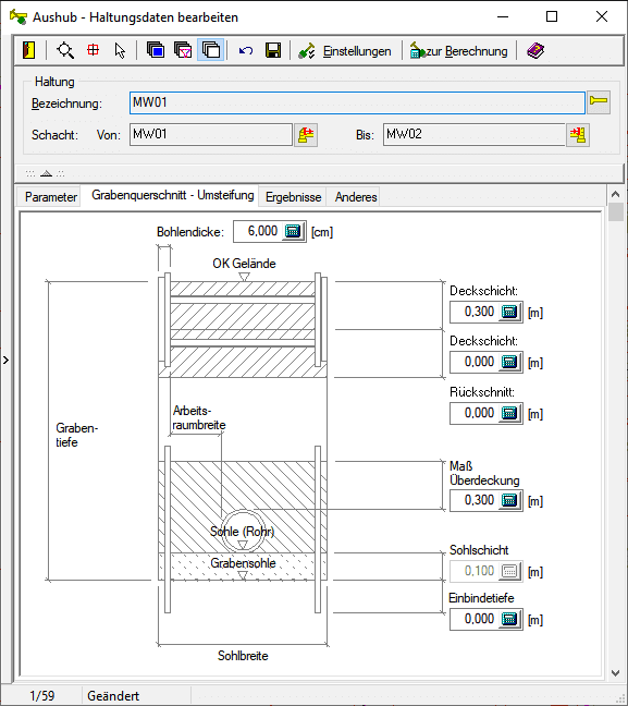 Als zusätzlicher Parameter kommt Maß Überdeckung hinzu. Mit dieser Maßangabe, Abstand vom Rohrscheitel, wird zusammen mit dem Außendurchmesser des Haltungsrohres die Höhe der Einbettungsschicht ermittelt.