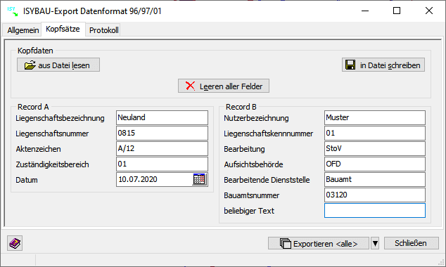 In den einzelnen Dialogfeldern können die Einträge für die Records A und B (siehe auch ISYBAU-Import) eingegeben werden.