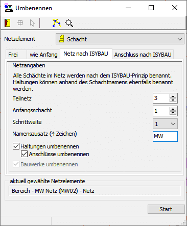 Sind im Kanalprojekt Bauwerke vorhanden, so können diese über den Schalter ebenfalls mit umbenannt werden. Alle im gewählten Netzbereich angeschlossenen Bauwerke werden nach dem ISYBAU-Prinzip umbenannt.