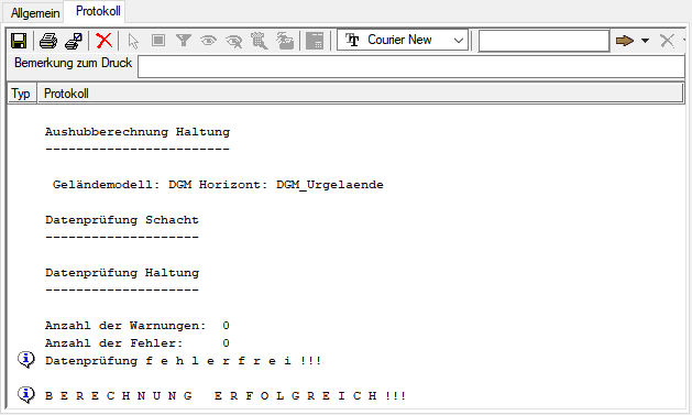 Vor der eigentlichen Berechnung wird eine Prüfung der Daten durchgeführt. Wurden keine Fehler oder Warnungen gefunden, so startet anschließend die eigentliche Aushubberechnung.