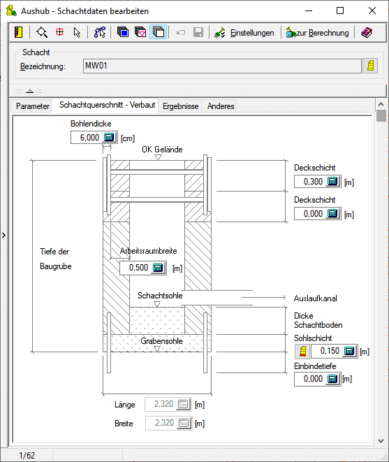 Bei der Verwendung der Einstellung Berechnung der Schachtbaugrube unter Verwendung der Vorgabewerte für die Schachtbaugrube wird die Bohlendicke bei der Berechnung nicht verwendet und die Eingabe ist aus diesem Grunde nicht erlaubt.