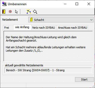 Der Name der Haltung/Anschlussleitung wird gleich dem Anfangsschacht gesetzt. Hat ein Schacht mehrere ablaufenden Haltungen erhalten weitere Leitungen den Zusatz /1, /2,....