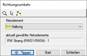 Eine Richtungsumkehr kann für die Netzelemente Haltung und Anschlussleitung erfolgen. Die Richtungsumkehr funktioniert auch, wenn ein Bereich einstellt ist und die Schaltfläche Start betätigt wird.