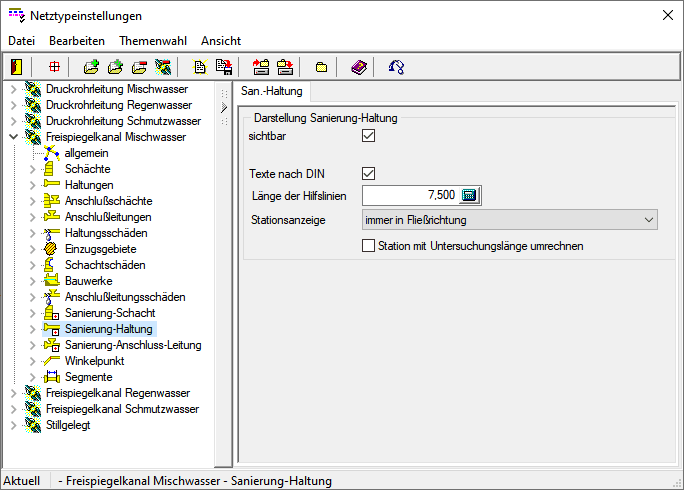 Die Stationsanzeige bei Sanierung-Haltung/-Anschlussleitung ist auf "immer in Fließrichtung" voreingestellt. Dies entspricht damit der Voreinstellung für die Schäden und den ISYBAU-Vorgaben.
