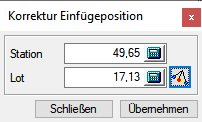 Zusätzlich laufen in Anhängigkeit von der Cursorposition die Station, vom Anfangsschacht der Haltung gerechnet, sowie der lotrechte Abstand des Cursors von der Haltung, im Eingabebereich mit. Nach dem Erzeugen des Schachtes haben Sie die Möglichkeit im Dialog Korrektur Einfügeposition die Station und den lotechten Abstand des neuen Schachtes zu verändern.