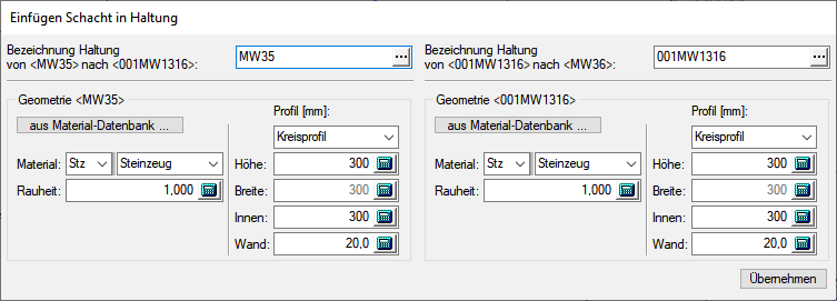 Die geometrischen Parameter wie Material, Profil und Profilhöhe werden von der Basishaltung auf die beiden neuen Haltungen übernommen. Die Sohlhöhen am neuen Schacht werden aus dem Gefälle der getippten Haltung berechnet.