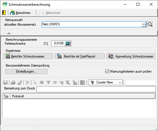 Die Netzauswahl, die Einstellung der Berechnungsparameter und die Ergebnisausgabe und -auswertung erfolgen im Dialog Schmutzwasserberechnung.