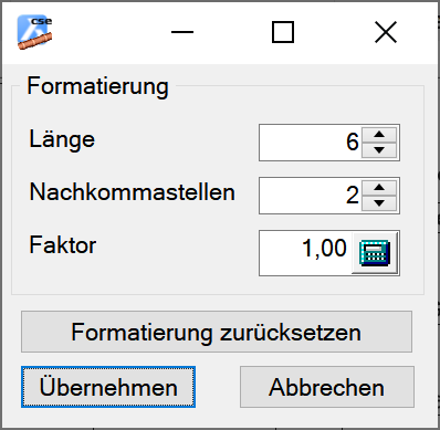 Hier kann man die minimale Zeichenlänge, die Anzahl der Nachkommastellen und einen Faktor angeben.