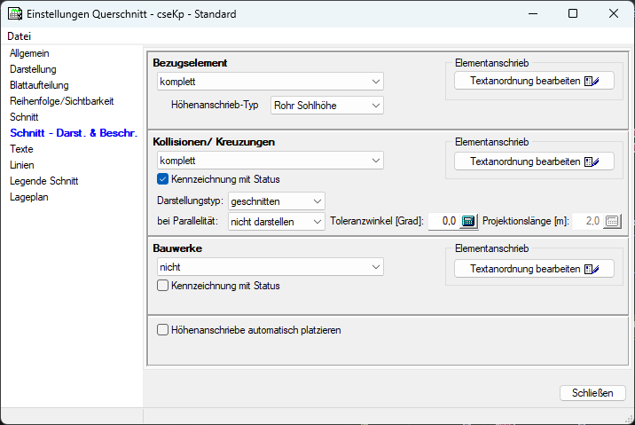 Hier kann festgelegt werden wie Kreuzungen und Kollisionen im Längsschnitt dargestellt werden.