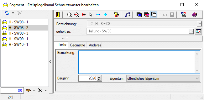 Der Name der Segmente steht im Datenbankdialog im oberen Textfeld Bezeichnung. Der Name setzt sich aus der Kennung des Segmentes, das Kurzzeichen der jeweiligen Netzelementklasse und den Namen des Bezugselementes zusammen.