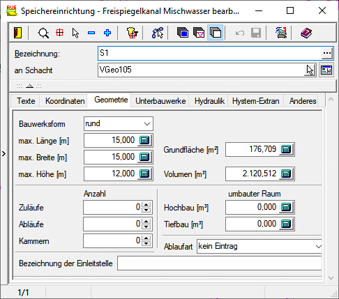 Für alle Speichereinrichtungen können Sie geometrische Bauwerksparameter eingeben. Diese Daten entsprechen dem ISYBAU-Austauschformat Bautechnik Sonderbauwerke, Typ ST.