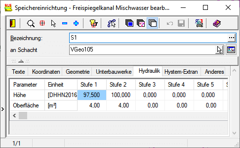 Die Hydraulikdaten für Speichereinrichtungen können in der folgenden Registerkarte eingegeben und geändert werden.