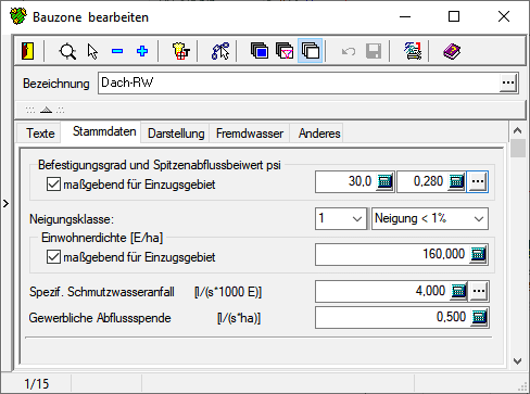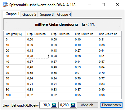 Nach Auswahl eines Wertes aus der Tabelle werden der Befestigungsgrad, der Spitzenabflussbeiwert und die Neigungsklasse entsprechend gesetzt. Diese Werte sind für die Ermittlung der Regenwasserabflussmengen am Einzugsgebiet wichtig.