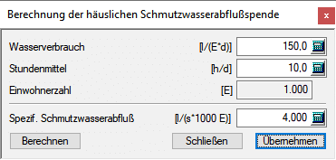 Dazu kann der Wasserverbrauch je Einwohner und Tag, sowie das Stundenmittel (die Anzahl der Stunden am Tag, in denen das Wasser tatsächlich verbraucht wird) eingegeben werden. Diese Werte werden nicht innerhalb der Bauzone gespeichert, sondern dienen nur als Berechnungshilfe. Nach Betätigen der Schaltfläche Berechnen wird der spezifische Schmutzwasseranfall bezogen auf 1000 Einwohner berechnet.