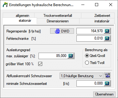 Die Voreinstellungen für das Zeitbeiwertverfahren und der Schmutzwasserberechnung können vor Durchführung der Berechnung noch geändert werden.