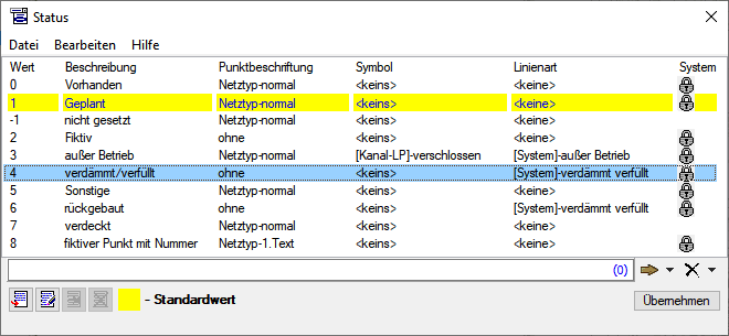 Die Angaben für Symbol und Linienart sind für eine statusabhängige Darstellung notwendig. Hier zugewiesene Symbole und Linienarten überlagern, bei gesetztem Status am Netzelement, das in den Netztypeinstellungen festgelegte Symbol. Das hier festgelegte Symbol wird also zusätzlich dargestellt.