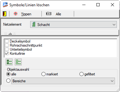Durch Alle / Markierte / Gefilterte werden die Bestandteile mehrerer Elemente (Im Beispiel Schacht) gelöscht.