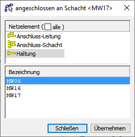 Über das Eingabefeld Netzelement wird das gewünschte Netzelement dessen Objekte auf den aktuellen Schacht verweisen, eingestellt und in dem Listenfeld Bezeichnung dann das Objekt dessen Daten angezeigt werden sollen, ausgewählt.