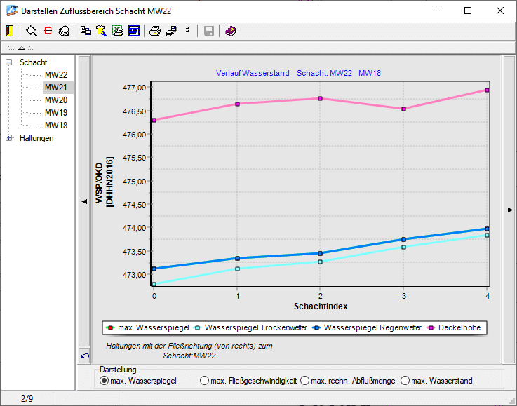 Fließgeschwindigkeiten, Durchflussmenge und Wassersspiegelhöhen der Haltungen in