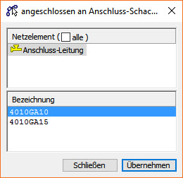 Über das Eingabefeld Netzelement wird das gewünschte Netzelement dessen Objekte auf den aktuellen Anschlussschacht verweisen eingestellt und in dem Listenfeld Bezeichnung dann das Objekt dessen Daten angezeigt werden sollen, ausgewählt.