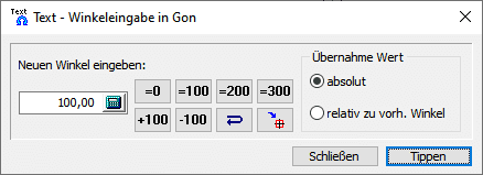 In der Optionsgruppe Übernahme Wert ist durch Betätigung des Optionsfeldes zu entscheiden, ob der gewünschte Wert absolut übernommen werden soll, oder der Text um den eingegebenen Winkel gedreht werden soll. Mit der Schaltfläche Tippen wird der Dialog geschlossen und der Cursor befindet sich im Auswahlmodus. Die zu ändernden Texte sind durch Antippen zu identifizieren, hierbei lassen sich die üblichen Selektionsfunktionalitäten des Tippcursors (Ausschnitt aufziehen, Einsammeln bei gedrückter Strg-Taste usw.) verwenden. Die Änderungen werden sofort durchgeführt.
