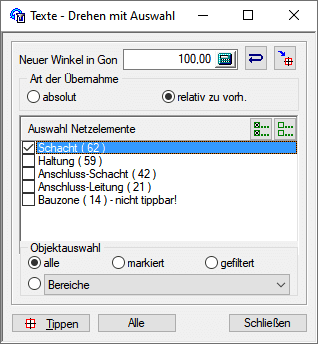 Sie dient der Übernahme eines vordefinierten Winkels für mehrere Textobjekte unterschiedlicher Netzelemente oder zur Änderung des Textwinkels mit einem Offsetwinkel für mehrere Textobjekte unterschiedlicher Netzelemente. Bei Verwendung dieser Funktionalität könnten z.B. alle Texte eines Netzes gleichzeitig bearbeitet werden.