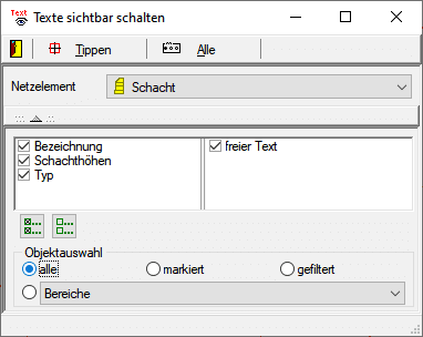 Die Einstellung im Bereich Objektauswahl wirkt sich beim Betätigen der Schaltfläche Alle aus. Hier können evtl. vorhandene Markierungen oder Filter für die Durchführung des Text einblenden berücksichtigt werden.