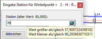 Als Hilfetext wird dabei der mögliche Stationsbereich angezeigt. Im Beispiel ist eine Eingabe im Bereich 57,91 bis 90,29 (gerundet) möglich.