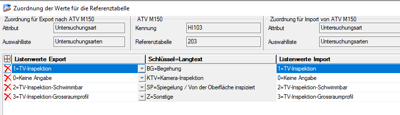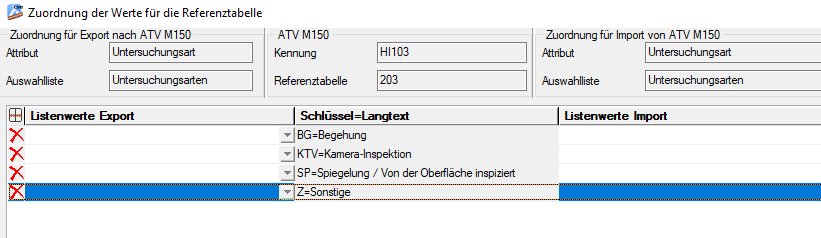 Das Format DWA-M 150 liefert u.U. auch Referenztabellen. Da die Vorschrift DWA-M 150 lediglich einen Vorschlag für die Inhalte der Referenztabellen unterbreitet, können hier die individuellen Vorgaben zu den zu importierenden Daten enthalten sein.