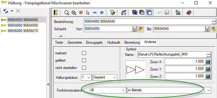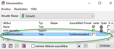 Zur Verarbeitung unserer Beispieldaten wurde jetzt eine Auswahlliste ‚Funktionszustand‘ angelegt, sowie Schacht/Anschluss-Schacht/Haltung/Anschluss-Leitung ein Attribut ‚Funktionszustand‘ hinzugefügt.