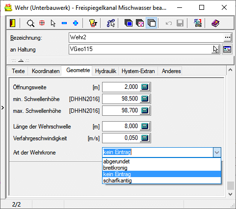 Die Geometriedaten für Wehre und Überläufe können in der folgenden Registerkarte eingegeben und geändert werden.