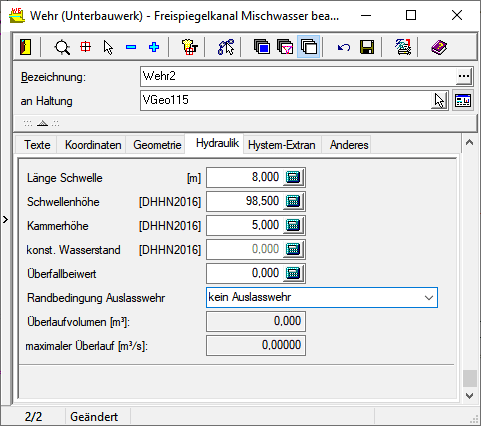 Für ein Wehr hat die Registerkarte Hydraulik folgendes Aussehen: