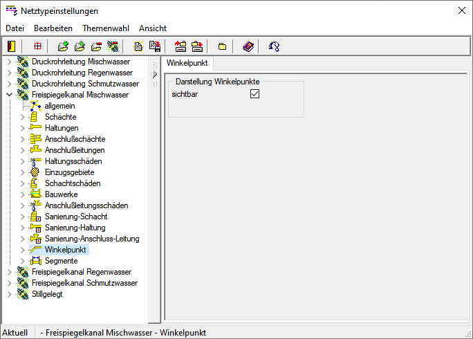 Im Einstellungsteil befinden sich 2 Kontrollkästchen, mit denen die Winkelpunkte aktiv und sichtbar geschaltet werden können. Der Unterschied zu den Darstellungsparametern der Kanalelemente besteht darin, dass hier die Grafikelemente aller Winkelpunkte des aktuellen Netztyps insgesamt mit einer Aktion ausgeschaltet werden können. Bei der Einstellung nicht sichtbar werden also alle Grafikelemente der Winkelpunkte nicht sichtbar geschaltet. Die Kontrollkästchen sind so miteinander verknüpft, dass nicht sichtbare Elemente automatisch inaktiv geschaltet werden.